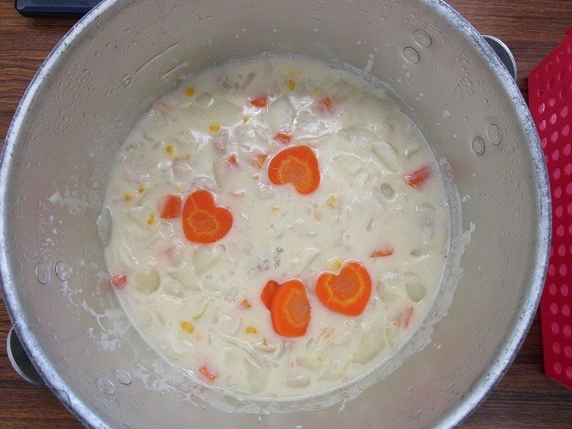 写真のコーンのクリームシチューをよく見ると、ニンジンがかわいらしいハート形に切られていることに気づきます。実はこれ、ある子どもと調理員さんとの間で交わされた「次にニンジンを切るときはハート形にしてね」という小さな約束がきっかけだったそうです。