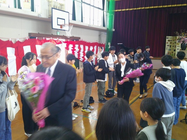 本日9時より、離任式が行われました。乾隆小学校の子どもたちの成長を願い、日々さまざまな形で深い愛情を注いでこられた教職員の先生方とのお別れの時間は、胸が締め付けられるような、たいへん寂しいひとときとなりました。式では、これまでの思い出を振り返りながら涙を流す教職員の先生方や子どもたちの姿が見られ、それぞれの感謝や惜別の思いが会場いっぱいにあふれていました。教職員の先生方と子どもたちの強い絆を感じる、温かく心に残る離任式となりました。