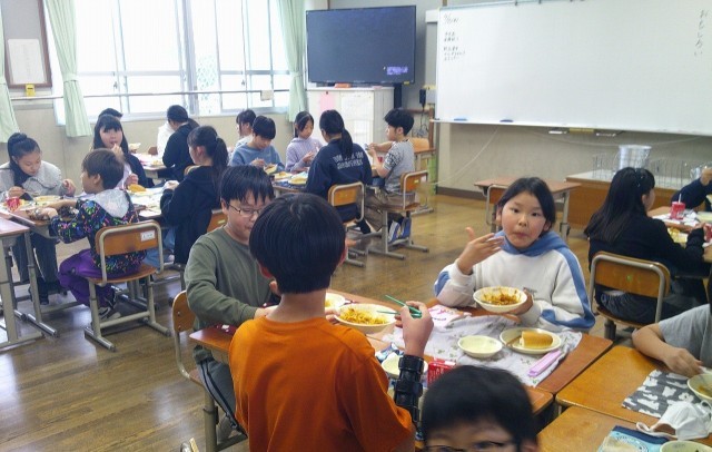 今日から給食が始まりました。給食当番も5・6年が混ざったグループでします。食事中の教室をのぞいてみると、5年生は5年生同士、6年生は6年生同士で机をくっつけて食べていました。しばらくしたら、食べるグループも学年混ざって食べていく予定です。