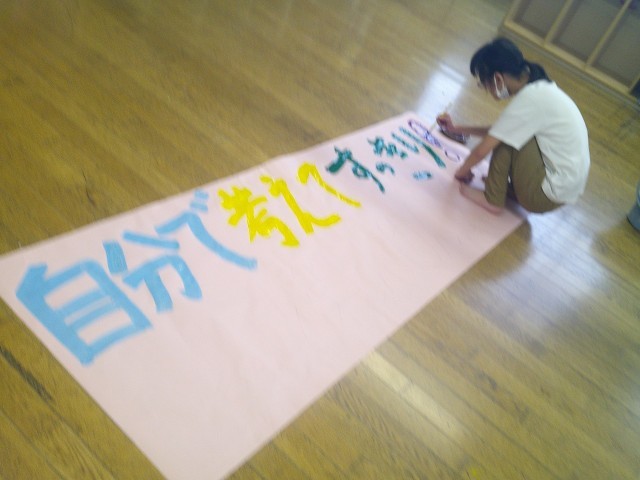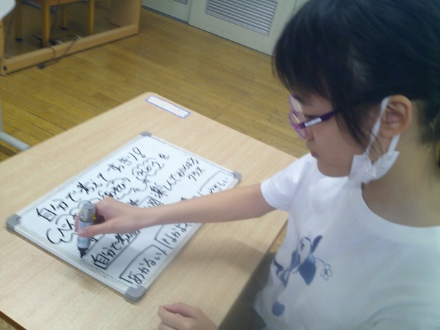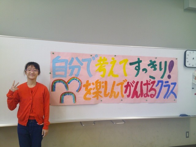 昨年度の学級目標を見ながら、今年度の学級目標を考えて作りました。ホワイトボードに考えた言葉を書き、目標を作っていきました。今年度のコスモス学級の学級目標は「自分で考えてすっきり!べんきょう うんどう あそびを楽しんでがんばるクラス」です。この目標に向かって、1年間楽しくがんばっていきたいです!