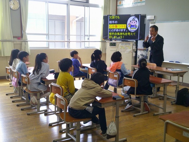 上京警察署の方に来ていただき、非行防止教室をおこないました。ルールを守ることや、人を傷つけてはいけないことについて、とても分かりやすく教えていただきました。子ども達も真剣に聞いていました。高学年として、下の学年のお手本になる行動をしていきたいですね。
