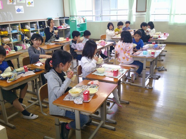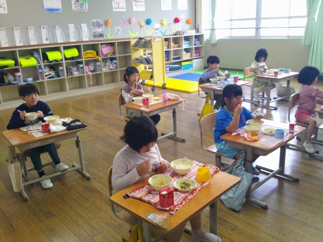 1年生も少しずつ給食に慣れてきました。自分たちで準備や片づけをすることも頑張っています。中学年ユニットは席替えをして、学年を意識することなく自然な会話をしながら食べていました。
