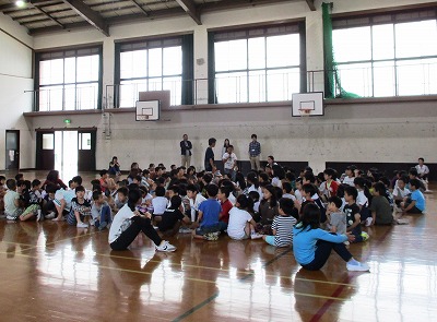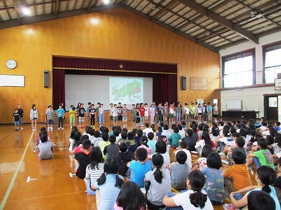 今年度第1回目のしょうらんタイムの発表は,6年生でした。6年生は,全員で英語の絵本の群読をしてくれました。色々な動物や色の名前が出てくる,楽しい絵本でした。