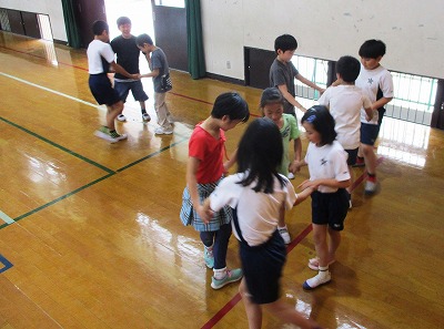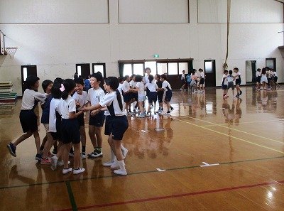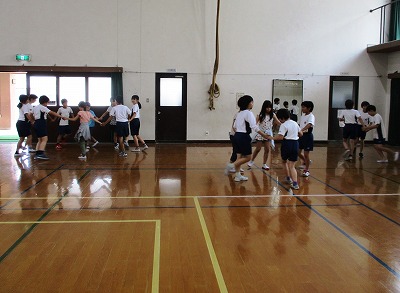 キャンプファイヤーでは,「マイムマイム」を踊るのですが,翔鸞小学校では毎年,5年生が4年生に踊り方を教えます。グループごとに踊っているところもあれば,個人レッスンをしているところもあります。教える方も教わる方も,暑い体育館で一生懸命です。