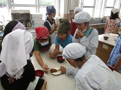 野菜やお揚げは,みんなで手分けをして切りました。自家製の梅干し入りのおむすびもご用意していただき,子ども達はとても満足そうな顔でいただいていました。一つ一つの材料や作り方を大切にした京料理の世界を,少し体験させていただきました。ありがとうございました。