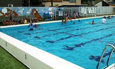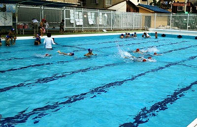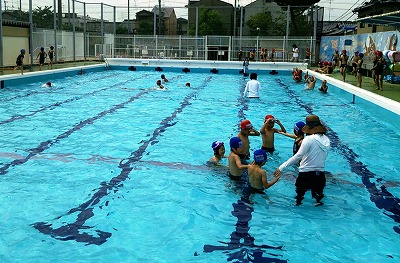 前半に水遊びをした後,顔をつける練習をしているグループ,ビート板でバタ足の練習をしているグループ,ビート板をはずして泳ぐ練習をしているグループに分かれて練習をしました。どのグループも,何度も何度も水に入って,頑張って練習をしていました。
