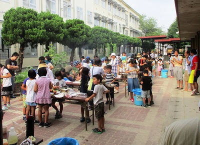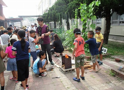 一斗缶のかまどに新聞紙や薪を入れて火を熾そうとしています。みさきの家や山の家で経験済みの,4・5・6年生が活躍していました。