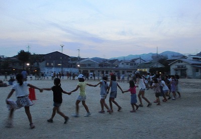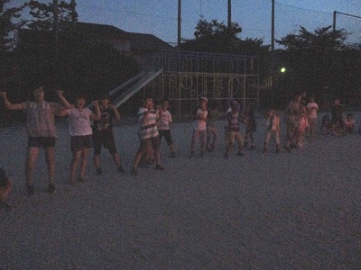 日が暮れて,キャンプファイヤーが始まりました。みんなで大きな大きな円になって,「ヘイッ!」と大きな声を掛けながら「マイムマイム」を踊りました。