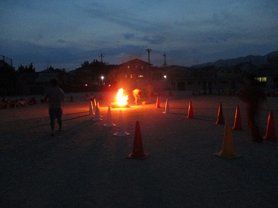 すると,炎がスルスルと下りてきてファイヤーが点火されました。ファイヤーの炎を囲んで,「PPAP]を歌ったりゲームをしたりと,みんなで大いに盛り上がりました。