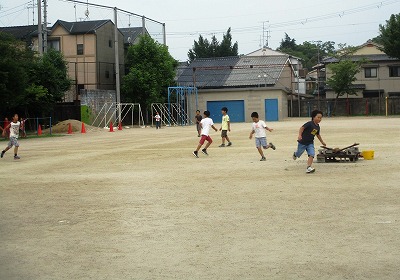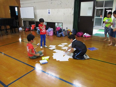 元気いっぱいの子ども達は,5時になると,もう我慢ができずに動き出しました。タオルケットを片付けると,運動場で体育館で遊び出しました。