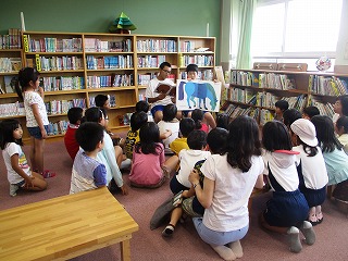 休み時間には,図書館で読聞かせをしてくれました。小学生の子ども達は,静かにお話を聞いていました。
