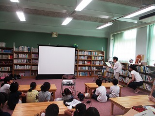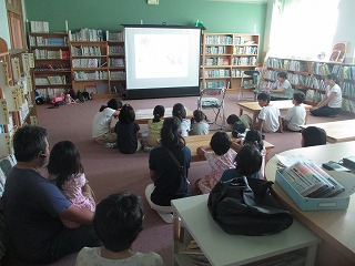 大きなスクリーンに絵を映しながら,「弁慶と牛若丸」のお話を聴きました。子ども達は,スクリーンの絵を見つめながら,静かにお話を聴いていました。牛若丸は,子どもの頃に鞍馬山の天狗に武術を習ったという言い伝えがあるので,お話しの後,天狗についての本も紹介していただきました。