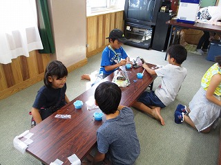ミニプールで金魚すくいをしたり,タオルでウサギを作ったり,かき氷を食べたり,おもちゃであそんだりと,子ども達は思い思いに楽しんでいました。