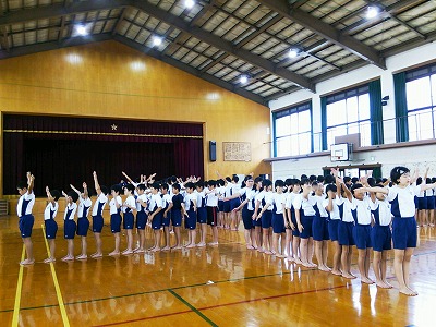 一人技から練習を始めて,3人技5人技と,できる技が増えてきました。また,全体できれいに動きをそろえることもできてきました。高学年の子ども達は,集中し協力して練習を重ねています。