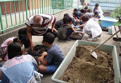 植え替えの仕方を教えていただき,一人4つずつ,丁寧に植え替えました。次は,花壇に植え替えます。大きく育つのが楽しみです。