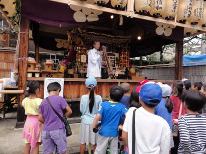 2年生が,午前9時50分学校出発で,瑞饋(ずいき)祭の御旅所へ御神輿を見学に行きました。瑞饋祭は,めでたいしるしを送るお祭りです。平安時代,西ノ京神人が五穀豊穣を感謝しそのお礼として旧暦9月9日(重陽に節句)に自分たちが作った新穀・野菜・果実等に草花などを飾り付け,菅原道真公の神前にお供えしたのがこの祭りの始まりです。