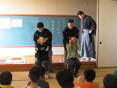面をつけると,上下左右の視野がとても狭くなるそうです。その狭い視野の中で舞台をいっぱいに使って演じることの大変さに,とても驚いていました。