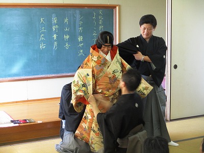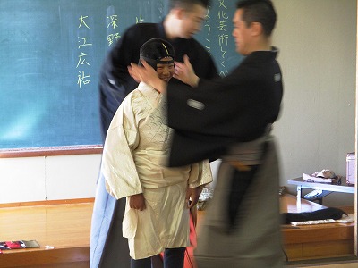 能装束をつける体験は,男子児童がさせていただきました。衣装と鬘をつけると,男の子が見る見るかわいい女性に変身していきました。衣装は西陣織,翔鸞校区の伝統産業の一つです。