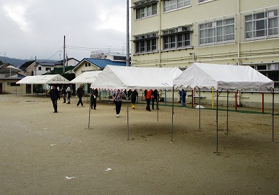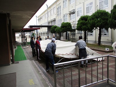 運動場では,雨が上がってきたので,テントを張ってそれぞれのお店の準備をしてくださいました。皆さんが笑顔で楽しい1日がすごせるようにと,今も早朝から皆さんが準備を進めてくださっています。