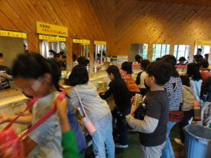 竹箸作りも終わりラインOLも順調に行きました。山道をグループで2時間以上歩きクイズをと浮いて回ります。全グループ無事ゴールインです。今から就寝準備をしたら夕食です。楽しみなバイキングです。