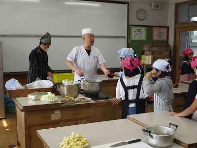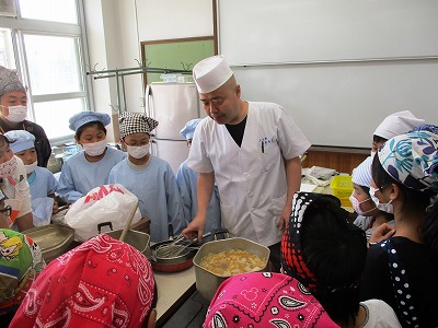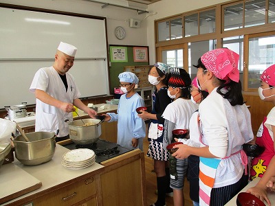 その後,みんなで切ったごぼうや人参等の具材と,紅梅庵様自家製のお味噌を入れて作った豚汁をいただきました。「おいしい。」と,おかわりをしている子もたくさんいました。本物の味を体験させていただき,本当にありがとうございました。