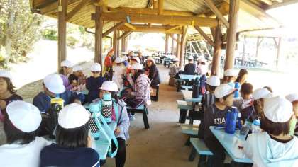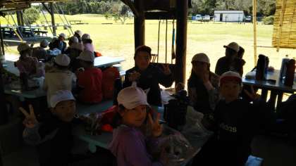 あずま屋でおひるごはんです。みんなお腹ペコペコだったので笑顔一杯です。