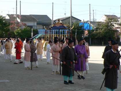 本日の時代祭には,翔鸞小学校の地域の方々が参列されます。朝早くから衣装を身に着け,行列の行進のリハーサルをされました。その様子を見学していた児童からは,雅な衣装に歓声が上がっていました。本日の時代祭が無事に終わりますように・・・気を付けていってらっしゃい。