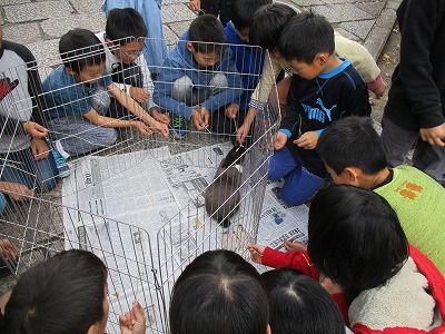 中間休みの時間に,1クラスずつ,ウサギにえさをあげたり抱っこをしたりします。チモシーを1本もらって,うさぎに食べてもらおうと一生懸命に声をかけたり,ひざの上にウサギを乗せてもらってそっとさわったり,みんなとても楽しそうでした。
