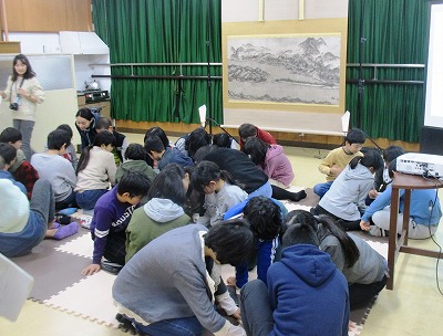 12月20日の2時間目,雪舟「橋立図」の高精細複製品の掛け軸を使っての授業がありました。複製品と言っても,最新のデジタル技術と伝統工芸の技で仕上げられた,オリジナル文化財に限りなく近いものです。