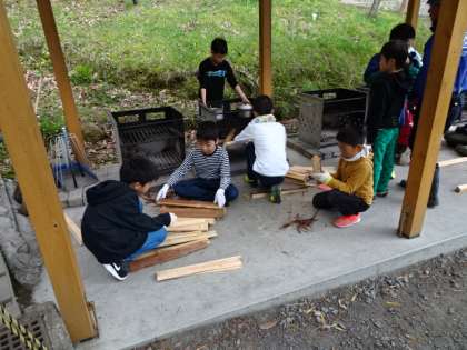 お米を研ぐ,具材を切る,まきを組む,それぞれの担当でがんばっています。