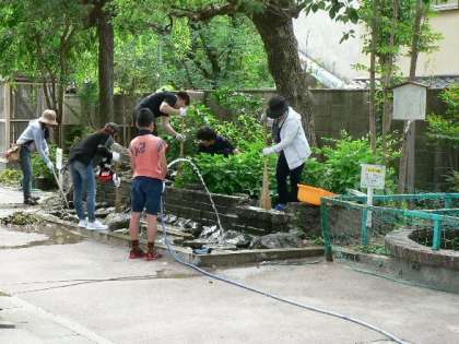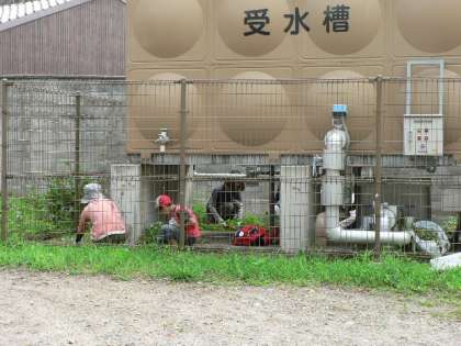 梅雨の晴れ間,定例の校内清掃を行いました。流水池の修繕のため,水を抜いて掃除をしていただいたり,受水槽の周りの草引きや新しい一輪車の整備をしたりしていただきました。朝早くから,ありがとうございました。