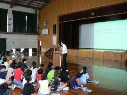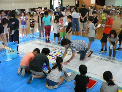 昼食の後は,創立150周年記念の横断幕の作成をしました。一人一人の手形を布に押していきます。完成した横断幕は,150周年記念式典等々に使用します。お楽しみに! その後は,学びの時間です。小学校150年の歴史のお話を聞きました。質問もしていました。