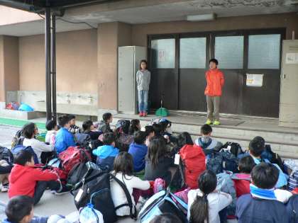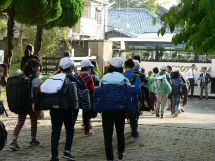 秋晴れの中,4年生がみさきの家に出発しました。磯浜観察や野外炊事,キャンプファイヤーなどの活動をします。自然の中で,友達と協力して野外活動を楽しんできてほしいと思います。
