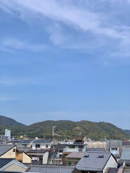 学校の3がい,ろう下のまどをあけると見えるふうけいです。左大文字がはっきり見えます。山のみどり,空の青,とてもきれいです。いつも見ているはずのふうけいも,あらためて見ると「こんなにきれいだったんだ」と気づくことがありますね。