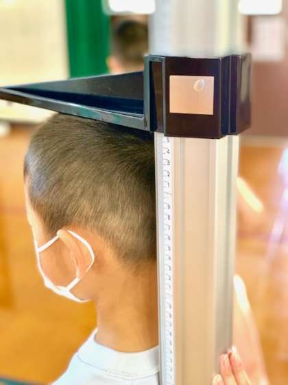 今回は,保健室での「密」を避けるために,学校で一番広い「体育館」で計測です。クラスを数グループに分けて,順番に身長と体重をはかりました。