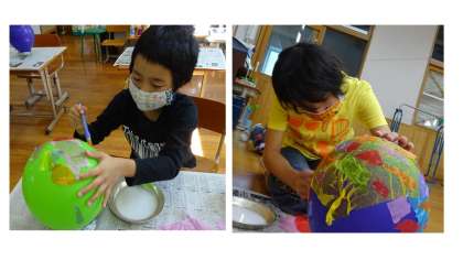 図工の時間に,ランプシェードをつくりました。膨らませた風船に,ボンド液を塗り,ちぎったお花紙を貼り付けます。風船が割れないように慎重に・・・みんなとても真剣です。乾くのに時間がかかります。