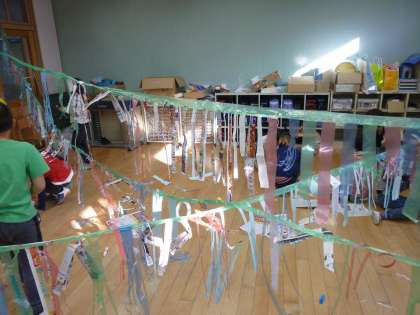 友だちと一緒に紙やテープを細く切って,どんどんつないでいきました。