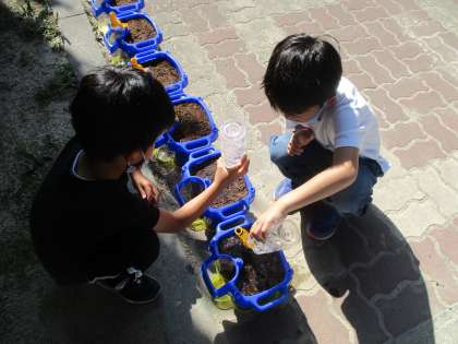 1年生はあさがおの種をまきました。何色の花が咲くのか楽しみにしています。朝,さっそく水やりを行い,土を見ながら「いつになったら芽が出るかな〜」と言っていました。