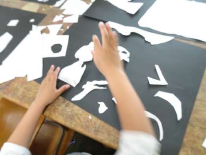 白い画用紙をはさみを使って,色々に切った後に,切った紙を黒い画用紙の上に置いてみました。