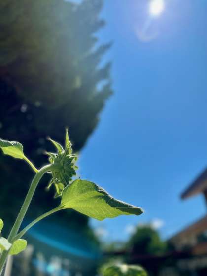 こんな中でも,校庭のひまわりは,大きな葉と,固く結んだ花のつぼみを太陽に向けてしっかりと立っています。本当にたくましいですね。