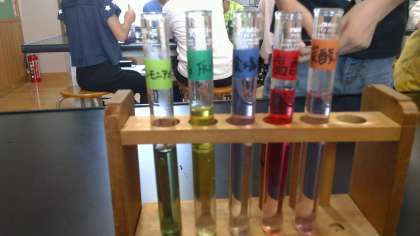 いろいろな水溶液が,酸性,中性,アルカリ性のどれに当てはまるかを見分けるためにこれまでリトマス紙を使ってきましたが,今回はムラサキキャベツ液を使って実験しました。色とりどりの実験結果をもとに,それぞれが考察していきます。
