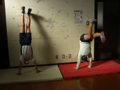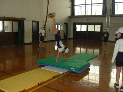 マット運動では,練習の場として,ゴムの場,段差の場,坂道の場などをつくり,練習方法を工夫しながらそれぞれが新しい技に挑戦しています。できる技を増やしつつ,連続技の披露に向けて頑張っています。マット運動も6年間の集大成です。もっている力を出し尽くしてほしいです。