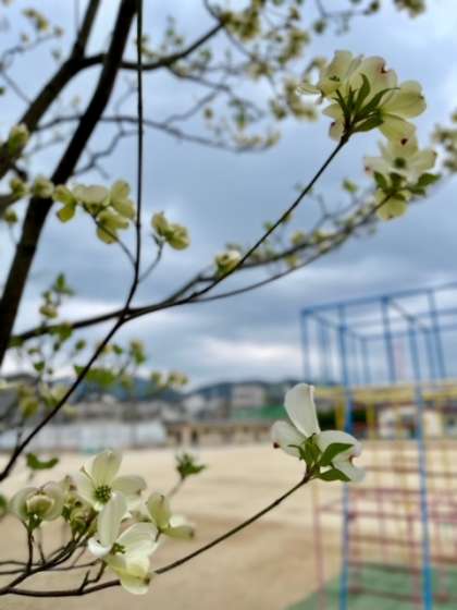 運動場の八重桜とハナミズキが綺麗な花を咲かせています。「ソメイヨシノの次は私。」と,まるで当番のように,順番に花を咲かせる木々たち。