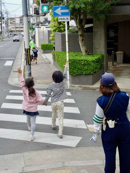 「青」になったら,右と左を確認して手を挙げて渡ります。右折や左折をしてくる自動車やバイクは,運転している人がこちらを見ているか確かめて。みんなしっかりできました。