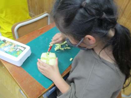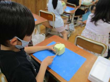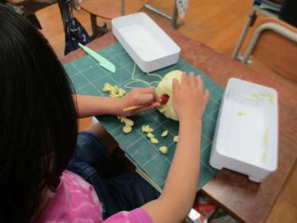 切り糸やかきべらを使って,ねん土の形をかえながらつくることを楽しみました。切り糸を使ってねん土を切ったり,へらでねん土をかき出してあなをあけてみたりしながら,思いついたものをつくっていました。