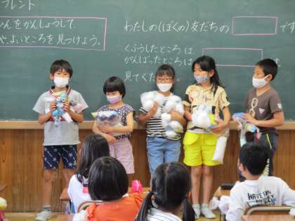 今日は作品の鑑賞をしました。袋の中に入れる物の色合いや形,袋の組み合わせ方を工夫しながらつくり上げた「友だち」を一人ずつ発表し,作品の工夫やよさをたくさん見つけて交流することができました。休み時間には,「友だち」と楽しそうに遊んでいる児童もいました。