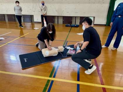 上京消防署の方に指導を受けながら,心肺蘇生法の一連の流れを確認していきます。