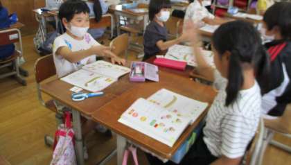 外国語活動では,20までの数の言い方を練習しています。前半は,発音を聞いて数字のカードを指し示したり,数字の歌に手拍子を入れて歌ったりしました。後半は,ペアで英語を使ってのじゃんけんを楽しみました。勝ったり負けたり・・・大盛り上がりでした。