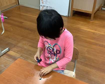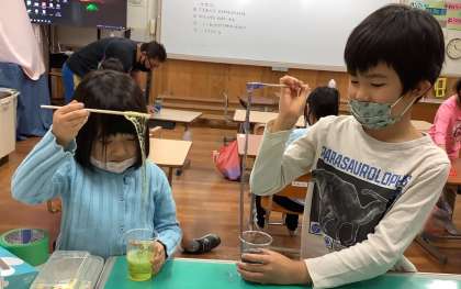 図画工作科の授業でスライムを作りました。カップを用意して材料を入れると,みんな一生懸命に混ぜました。混ぜると変わる感触や,友だちのスライムと混ぜたときの変化などいろんな発見をして楽しみました。
