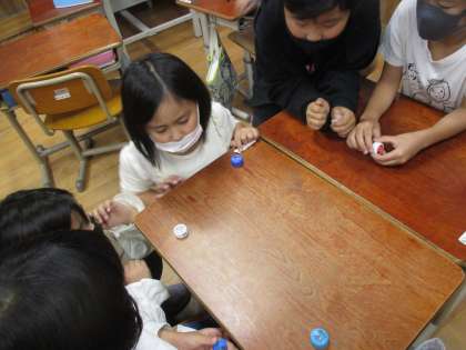 生活科で、身の回りのものを使って、はじく遊びを行いました。キャップを使い、指ではじきます。キャップを落とさずにうまく相手のキャップに当てたら勝ちになります。みんな大盛り上がりでした。